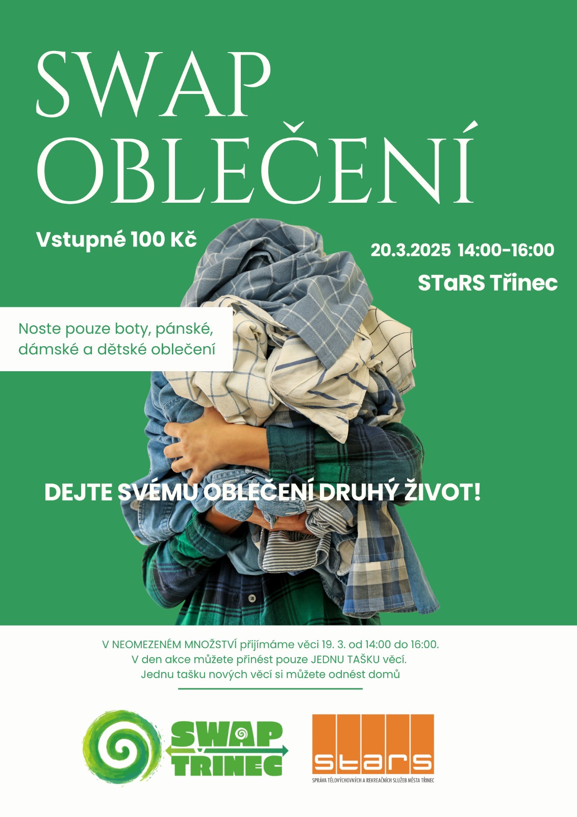 Pořádáme další SWAP naživo, tentokrát v hale STARS – sportovní hale v Třinci. Měnit se bude výhradně oblečení! Protřiďte šatník, vytáhněte věci, které už nenosíte a pošlete je dál. Určitě udělají radost někomu dalšímu. Vzít si naopak můžete, co se líbí vám. Tentokrát je množství omezeno na jednu klasickou tašku věcí.